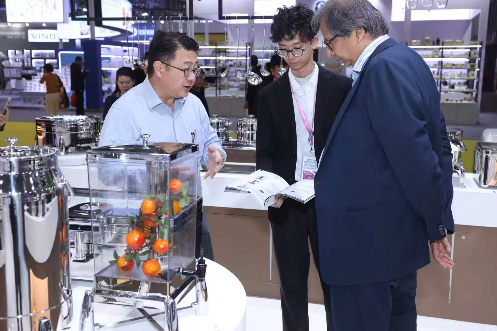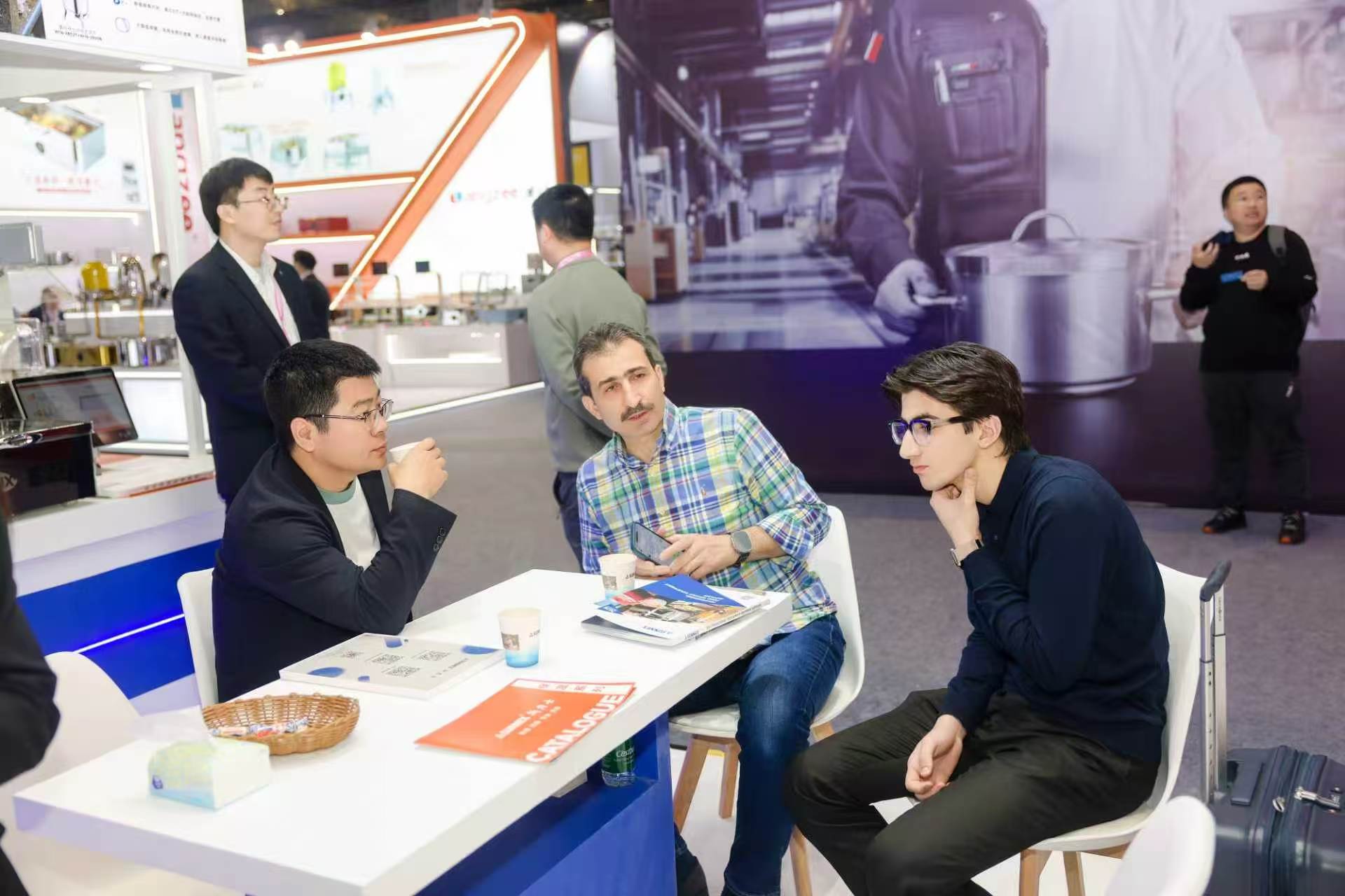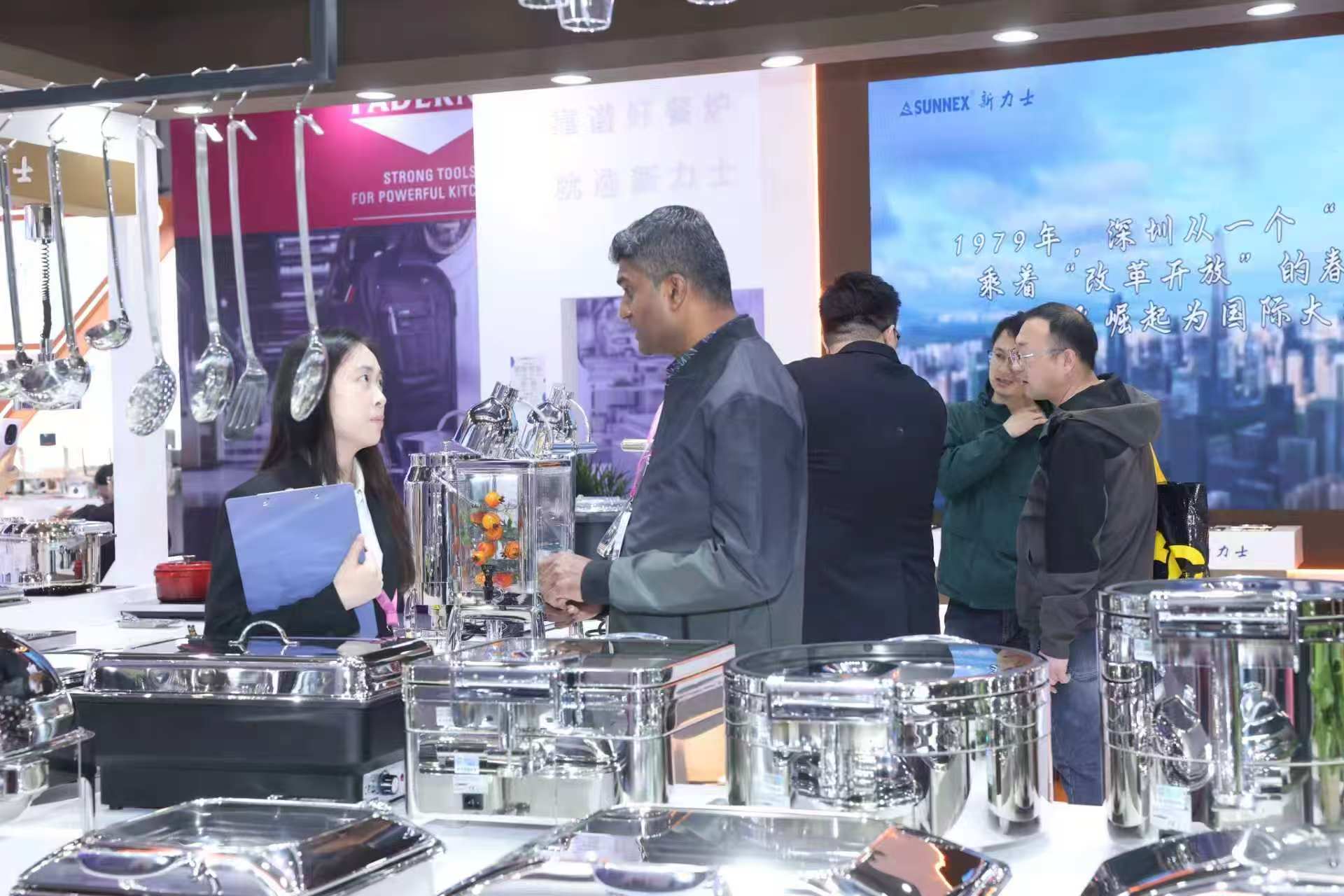 கண்காட்சியின் போது, நீரற்ற உலர் சாஃபிங் உணவுகள், கிளாசிக் ஸ்டெயின்லெஸ் ஸ்டீல் கேஸ்ட்ரோனார்ம் பான்கள், வெரோனா சீரிஸ் பால் கலன்கள், ஐஸ்-டியூப் டிஸ்பென்சர்கள் மற்றும் பிற புதிய தயாரிப்புகள், உயர்தர ஹோட்டல்கள், செயின் கேட்டரிங் பிராண்டுகள் மற்றும் பணியாளர் கேண்டீன்களின் பல்வேறு தேவைகளைப் பூர்த்தி செய்வதில் சிறந்த விற்பனையாளர்களைக் காட்சிப்படுத்துவதில் கவனம் செலுத்தியது. எங்கள் சாவடி மத்திய கிழக்கு, ஆப்பிரிக்கா, ஐரோப்பா, அமெரிக்கா மற்றும் தென்கிழக்கு ஆசியா முழுவதும் தொழில்முறை வெளிநாட்டு வாங்குபவர்களிடமிருந்து தொடர்ச்சியான வருகைகளைப் பெற்றது. எங்கள் நிபுணத்துவக் குழு ஒருவருக்கு ஒருவர் தயாரிப்பு அறிமுகங்கள் மற்றும் ஆழ்ந்த ஒத்துழைப்பு விவாதங்களுக்கு தனிப்பயனாக்கப்பட்ட தீர்வு ஆதரவை வழங்கியது.